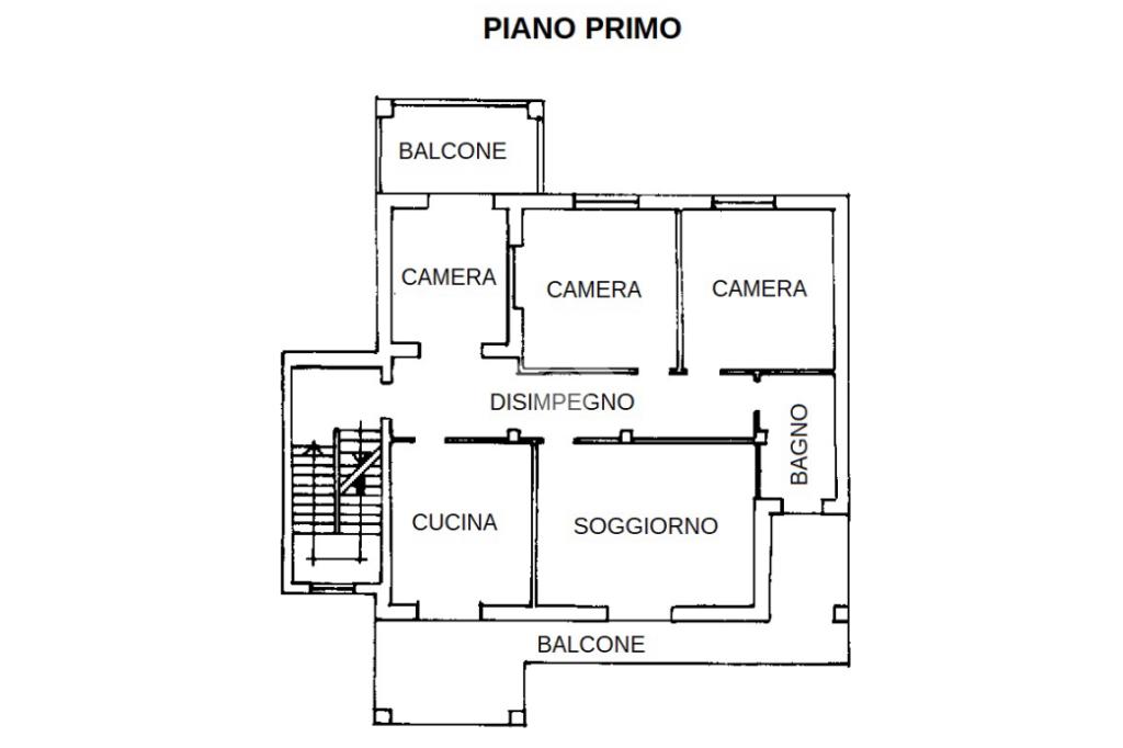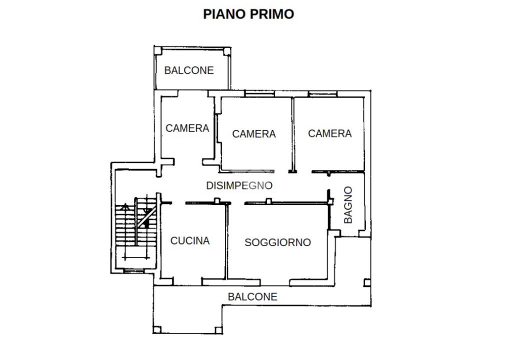 - Piano primo: luminosa zona giorno composta da entrata su disimpegno che conduce a tutte le stanze, cucina abitabile e soggiorno con accesso diretto al terrazzo; zona notte con tre camere da letto e bagno finestrato dotato di vasca.