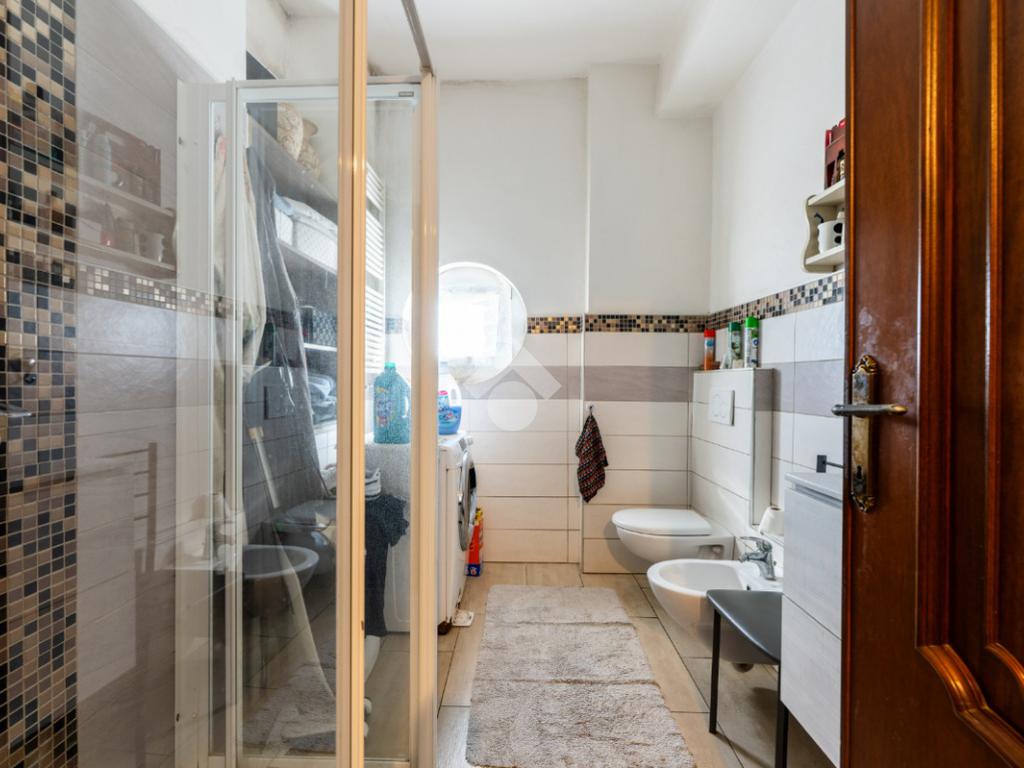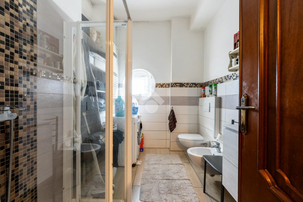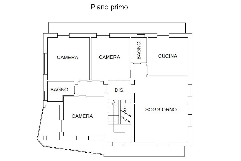 Al piano primo troviamo un ampio e luminoso alloggio composto da soggiorno, cucina, tre camere da letto e due bagni finestrati con box doccia, di cui uno a servizio della zona giorno e uno della zona notte.